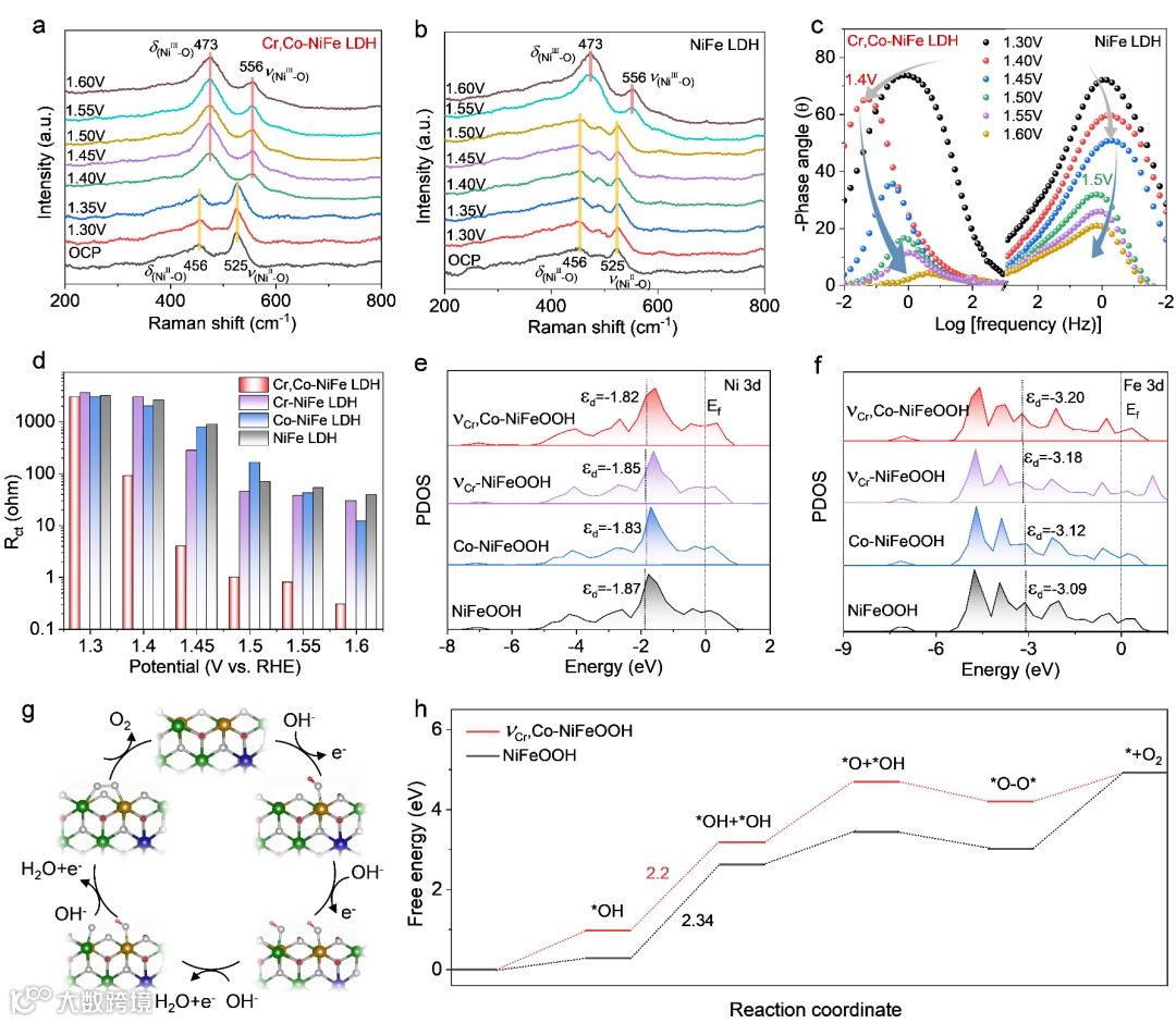 图6a,6b的原位拉曼光谱揭示Cr、Co共掺杂后加快的NiFe LDH的活化速率,降低了NiFe-LDH自活化过程中的功率损耗。图6c的原位EIS进一步表明引入Cr和Co元素后NiFe-LDH的活化电位大幅降低,表明二者协同加快NiFe-LDH的活化转变,具有更好的反应动力学速率。此外,图6d中随着电位的增加,尤其是在高电位下,Cr,Co-NiFe LDH的Rct值与其他样品相比显著降低,可以推断出Cr和Co共掺杂有助于加速活化转化,从而更快地形成VCr,Co−NiFeOOH。这意味着Cr空位和Co掺杂的协同作用可以提高Ni和Fe的催化活性,增加电子转移,从而提高OER动力学。图6e,6f中DOS结果表明Co和Cr空位的引入使Ni的d带中心接近费米能级,使Fe的d带中心远离费米能级,说明增强了中间体在Ni上的吸附,减弱了中间体在Fe上的吸附。图6g,6h的双位点的台阶图可以看出Co和Cr空位引入后,可将NiFeOOH的RDS能垒从2.34 eV降低至2.2 eV,表明Cr空位和Co共掺杂所产生的协同作用可以通过调控Ni−Fe双活性位点中心的电子结构来降低OER的反应能垒,提升OER催化活性。
