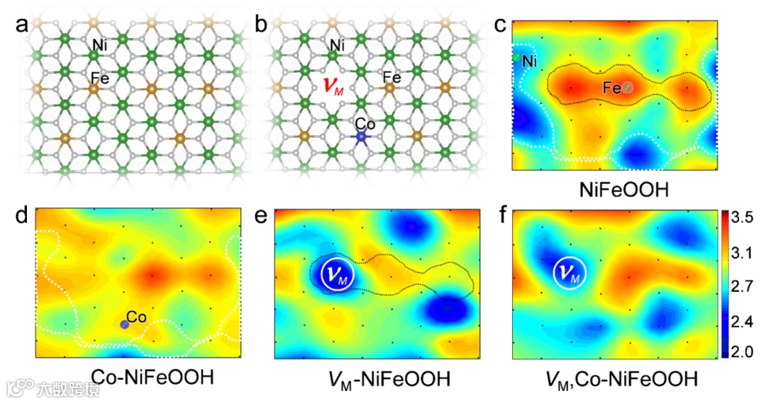 图2. 催化剂模型和不同位点上OH−的吸附能。(a)NiFeOOH,(b)VM,Co-NiFeOOH的模型;OH−在(c)NiFeOOH,(d)Co-NiFeOOH,(e)VM-NiFeOOH和(f)VM,Co-NiFeOOH上不同位点的吸附能。