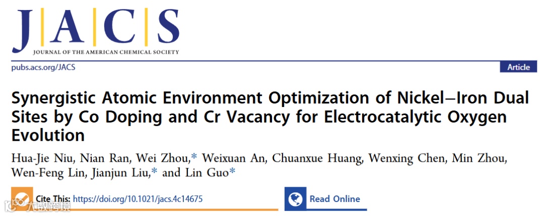 近日,北京航空航天大学的周苇、郭林教授与中国科学院上海硅酸盐研究所的刘建军研究员合作,在国际顶级期刊Journal of the American Chemical Society上发表题为“Synergistic Atomic Environment Optimization of Nickel−Iron Dual Sites by Co Doping and Cr Vacancy for Electrocatalytic Oxygen Evolution”的文章。该工作以非晶NiFeOOH为基础,重点研究了Co掺杂和Cr空位对Ni-Fe双位点的局域微环境的调控,并揭示了OER催化机制。