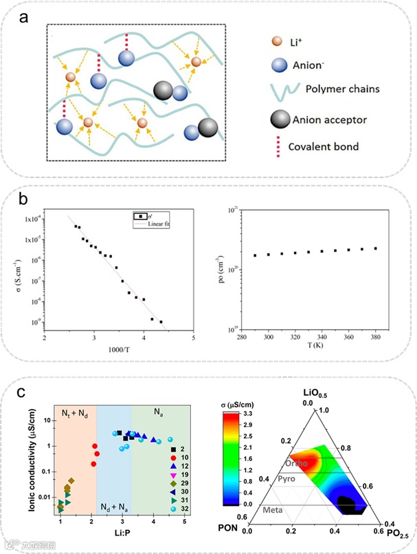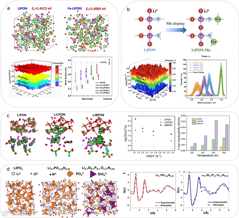 固态电解质中离子输运性质与电解质类型息息相关。实验结果表明,LiPON中的离子输运机制主要是在固定浓度的一种载流子中进行。此外,只有部分锂离子参与了传导过程。离子电导率对化学成分的依赖性较强,在不同的Li含量区域,Li/P比值显著影响离子电导率,且在顶端氮、二桥氮和三桥氮中表现出较大差异。磷酸基排列与离子电导率关系的相图进一步表明,三配位氮的存在主要表现在偏磷酸盐和焦磷酸盐排列中。同时,缺陷存在与结晶化程度也对离子传输产生重要影响。虽然在探索LiPON中的离子输运,特别是化学成分的影响方面已经取得了突破,但从实验和计算技术的结合中获得更直观的理解,仍然需要开发更先进的表征和分析方法。室温下过低的离子电导率 (~10-6 S cm-1)极大地阻碍了LiPON在固态锂金属电池中的应用。掺杂和取代被认为是增强电解质电导率的有效策略。增加其结构内的氮含量之外,多种金属元素如镁、锗、铁、锰等,非金属元素如碳、硼、硅等均对于离子电导率有一定提升。此外,其他阳离子如钨、铝、钛也显示出增加离子电导率的巨大潜力。对混合离子掺杂的增强机理也正在被深入研究。