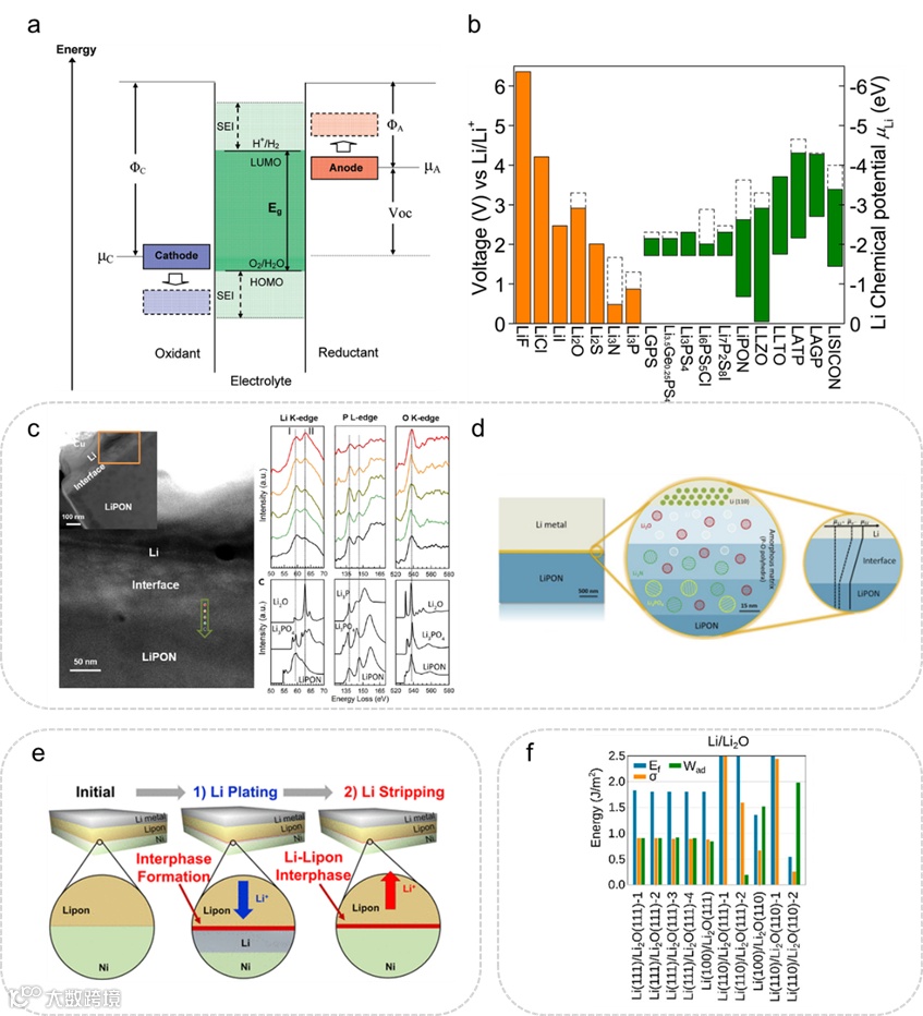 通过X射线光电子能谱谱(XPS)和低温透射电镜(Cryo-TEM)对于LiPON/Li界面进行了实验观察,还原电位为0.69 V,最终分解产物主要为Li3N、Li2O和Li3P。形成的SEI为多层镶嵌结构,分解后的Li3N、Li2O、Li3PO4等组分结晶嵌入无定形基体中,不含任何有机含锂物质或LiF,与传统液态电解质形成的结构明显不同。SEI的形成减少了施加在SSE上的高化学势,这是LiPON与Li金属阳极良好相容性的原因。
