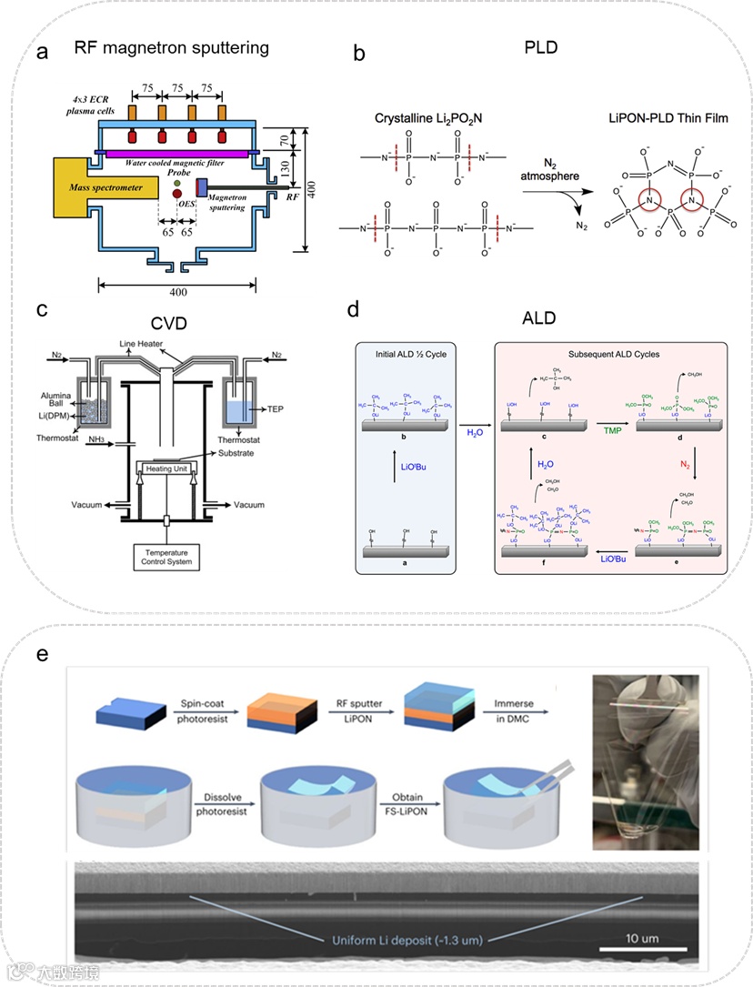高质量LiPON制备是实际应用中的另一个巨大挑战。射频磁控溅射技术作为最广泛采用的制备技术之外,多种方法在衬底表面形成LiPON层,包括ALD、化学气相沉积(CVD)、脉冲离子束辅助沉积(IBAD)、脉冲激光沉积(PLD)和等离子辅助定向气相沉积(PA-DVD)等已被成功开发。多种非晶LiPON薄膜制备新方法的发展不仅丰富了现有技术,而且拓展了LiPON的潜在应用。近年来,合成LiPON的湿化学方法在大规模制造中显示出巨大潜力,无需真空技术即可显著提高工艺经济性,但该项方法尚不成熟,仍处于起步阶段。此外,采用涂覆法和卷对卷法制备LiPON薄膜具有高度的工艺性和成本效益,但难以控制粒度和膜厚。