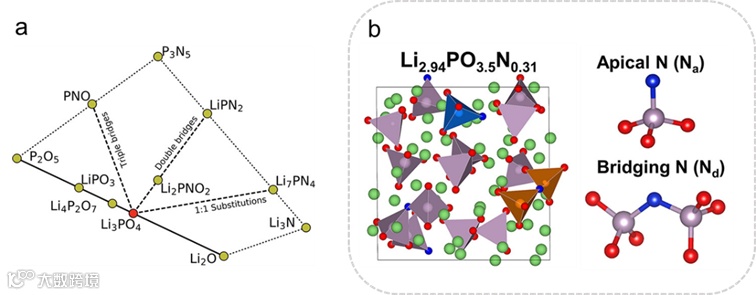 LiPON(LixPOyNz)作为一类典型的非晶态化合物,化学计量系数为x≈3,z < 0.5, 3 < (y + z) < 4。非晶结构对于理解结构-性能关系和制定合理设计高性能材料的标准增加了难度。虽然揭示LiPON的精确结构还有很长的路要走,但普遍认为氮磷键的存在会显著影响LiPON的整体性能。随着新型表征技术的发展,LiPON的结构逐步被全面解析,氮在分离的P(O,N)4四面体中有两种形式,一种是顶端氮(Na),另一种是两个磷酸基团之间的桥(Nb)。进一步研究表明,锂离子与阴离子的相互作用对离子电导率有显著影响。在陶瓷电解质中引入氮基团可以降低扩散屏障,而在基体中存在氧可以增加与Li+的相互作用。此外,N/P、Li/P比值对电解质的性能也起着重要的作用。上述研究表明,调整化学计量可能是改变LiPON性质的有效方法。
