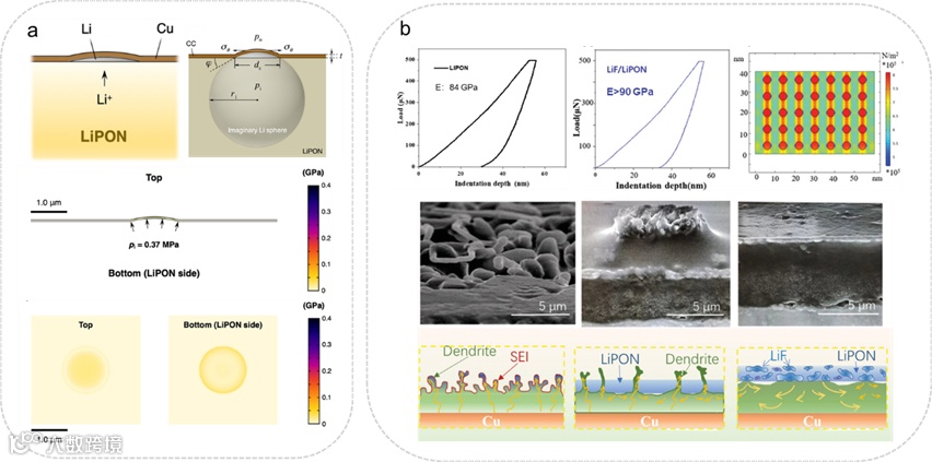 LiPON虽然已成功应用于高比能固态电池中,但其有限的力学性质会导致重复循环过程中脆性失效,特别是在高面容量沉积条件下。引入力学增强基质限制内部裂纹扩展提高整体力学稳定性尤为关键。研究表明,在Cu/LiPON界面处发生的锂成核会引起Cu膜局部变形,形成圆顶状突起,引发局部应力堆积。由于Cu/LiPON界面缺乏自由空间,形成的Li核触发Cu膜与LiPON分离,导致界面接触恶化。为了解决高速率长周期循环下的机械失效问题,以LiF等作为力学增强基质引入SEI中,能够显著增强SEI断裂韧性,提高界面力学稳定性。