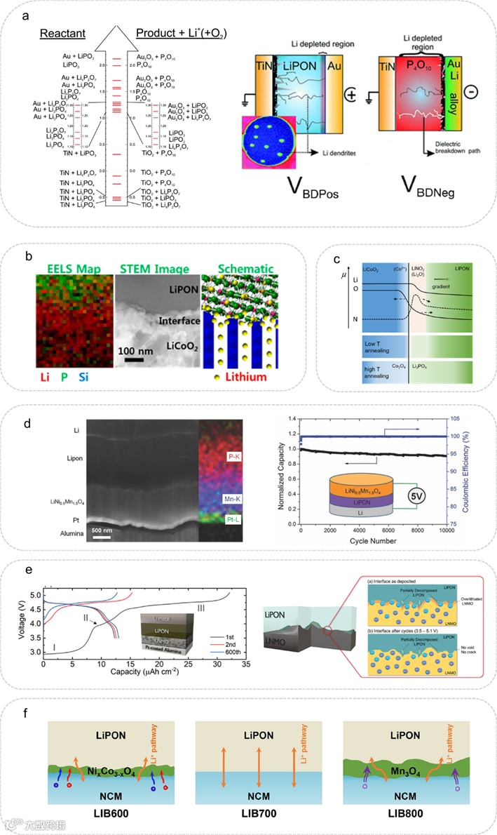 利用高电压正极材料可以进一步提高整体能量密度,了解外加电场作用下LiPON/正极界面演变具有重要意义。研究表明LiPON在4.3V下开始分解,伴随着Li+的释放,生成Li4P2O7、LiPO3等富磷化合物,最终生成P4O10组分,同时生成O2和N2。并且其分解以扩散受限方式进行。LiPON与以高压LiCoO2、尖晶石类LNMO、三元材料等各类高压或大容量正极的复合使用中体现出了良好的相容性,取得了很大的进展,但进一步了解LiPON/正极界面的演变,特别是在循环过程中,仍然是一个非常紧迫的问题,需要谨慎考虑对界面性能进行合理的修改,以优化界面性能,进一步提高整体性能。