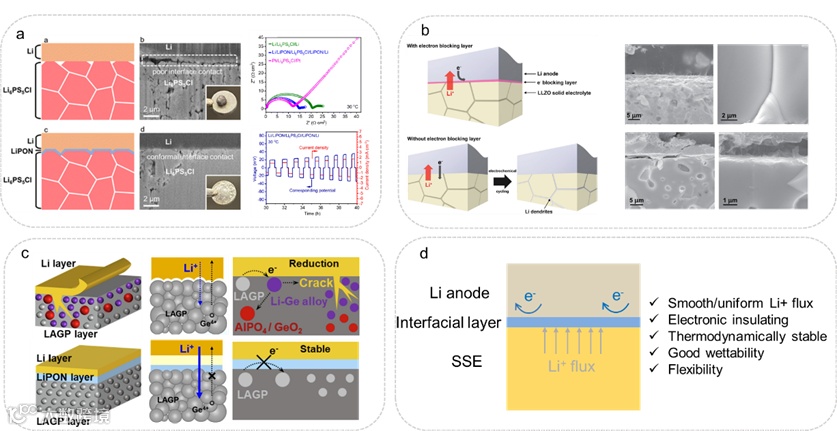 由于LiPON与Li负极的良好的界面相容性,近年来被应用于其他固态电解质体系中构建更优化的固态电解质/Li界面。LiPON作为功能中间层构筑的复合固态电解质具有较高的离子电导率,促进了锂离子在界面处的迁移,并且其电子绝缘性能也有助于抑制锂枝晶生长。良好的柔韧性有助于改善固态电解质与Li金属之间的机械接触。据此,提出了理想界面层的关键特征:(1)Li+通量均匀;(2)电子绝缘;(3)对金属锂具有热力学稳定性;(4)良好的润湿性,保证无接触缺陷;(5)具有一定的柔韧性。