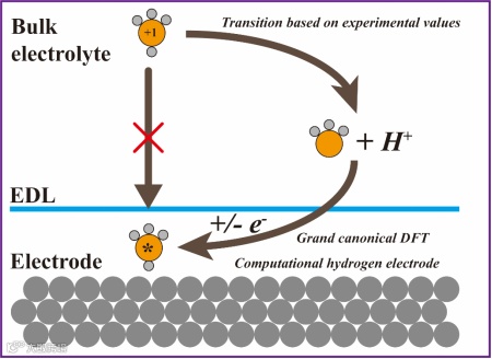 离子氢源在电极界面中的计算一直是学术界关注的热点,主要面对的问题有三个:1. 如何计算单个溶剂化离子的DFT能量;2. 如何考虑标准氢电极 (SHE)的影响;3. 如何考虑可逆氢电极(RHE)水平的影响。本文在Gao and Pillai工作的基础上,通过Henderson-Hasselbalch方程,将水溶液作为所有离子氢源的参考标准,大大扩展了该方法的使用范围,同时避免了直接计算单个溶剂化离子能量的问题。进一步地,本文使用巨正则DFT的计算方法,得到了绝对氢电极电势对电极界面离子状态的影响。除此以外,本文引入了计算氢电极(CHE),与Henderson-Hasselbalch方程的结合可以有效的计算出(H++e-)的能量。该方法具有极大的扩展性和通用性,可以应用于不同的催化剂界面计算以及不同的计算体系,例如二氧化碳电化学还原以及氮气还原。