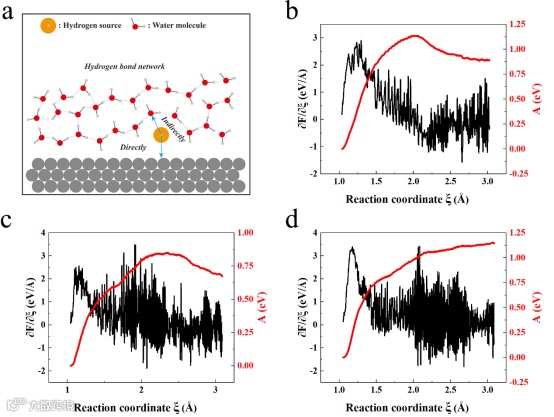 为了回答氢源物质能否直接参与电极界面HER反应的问题,本文从分子模拟的层面以氢源物质的迁移能量趋势和解离质子的转移方向作为综合判断标准。两步热力学循环的计算结果表明,负电氢源(H2PO4-)在反应电势区无法自发的接近电极界面,因此在宏观上,该物质只能通过缓冲作用来间接影响电极界面的HER反应。所以本文选取了三种正电氢源做进一步的计算,NH4+,MEAH+和IMZH+。结果表明,只有从NH4+上解离出的质子可以直接转移到电极界面。而对于其余两种氢源而言,解离出的质子会首先被水分子氢键网络所捕获。结果表明,氢源NH4+直接参加界面电极反应的可能性是存在的,而且其优异的HER性能也佐证了这一点。除此以外,本文也证明了在电极界面和水分子氢键网络之间存在对于游离质子的竞争机制。上述解离过程的具体信息可以参考原文补充材料中的视频附件。