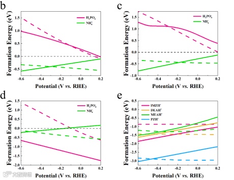 (2)离子类物质在电极界面的计算一直是研究的重点,本文结合了基于实验测量的pKa值,基于巨正则密度泛函理论计算的绝对氢电极电势的影响(SHE)以及基于计算氢电极(CHE)的电极电势对Henderson-Hasselbalch方程的影响。设计了一种针对离子态氢源物质的两步热力学循环计算方法,该方法以水溶液作为计算基准,可以从理论上计算出离子氢源物质(NH4+,H2PO4- 和HCO3-等)从体相电解质溶液转移到电极界面的能量趋势。