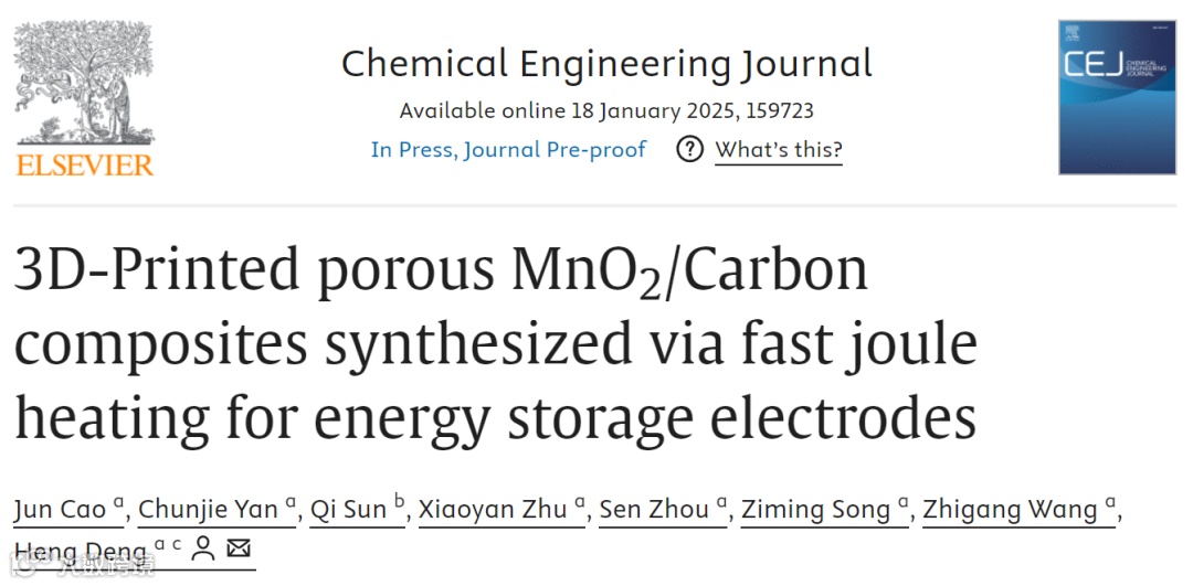 中国地质大学(武汉)邓恒教授团队在Chemical Engineering Journal发表“3D-Printed porous MnO₂/Carbon composites synthesized via fast joule heating for energy storage electrodes”论文。研究提出基于快速焦耳加热(FJH)合成多孔MnO₂/碳复合材料新方法并用于3D打印电极。在约1800°C、1秒内完成加热的极端条件下,将天然菱锰矿和聚酰亚胺转化为MnO₂纳米颗粒与碳纤维复合结构,实现MnO₂与高孔隙率碳强结合。该复合材料加工成导电油墨用于DIW技术打印定制结构3D电极。实验显示,超级电容器中比电容达411.3 mF cm⁻²(1.0 A g⁻¹),锂离子电池中400次循环后容量570.9 mAh g⁻¹、库仑效率97.8%。优异性能证明FJH方法高效,展示3D打印在高性能储能应用潜力,为下一代设备开发提供新方向。