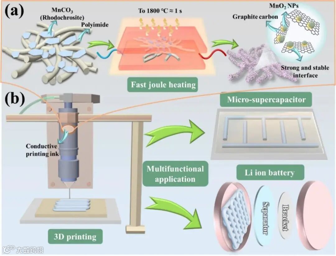 图1.快速焦耳加热(FJH)方法制备MnO₂/碳复合材料的示意图(a)以及3D打印电极的直接墨水写入(DIW)过程和应用(b)