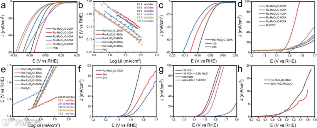 图3:a) HER 极化曲线;b) 相应的HER塔菲尔图。c) 稳定性测试前后的HER极化曲线对比。d) OER 极化曲线;e)相应的OER塔菲尔图。f) 稳定性测试前后的OER极化曲线对比。g) Ru-RuO₂/C-300A 在 1 M KOH、1 M KOH + 0.5 m NaCl、海水和海水 + 1 m KOH 中的 OER 极化曲线。h) Ru-RuO₂/C-300A在 1 m KOH 中进行全水解的电流-电位曲线。