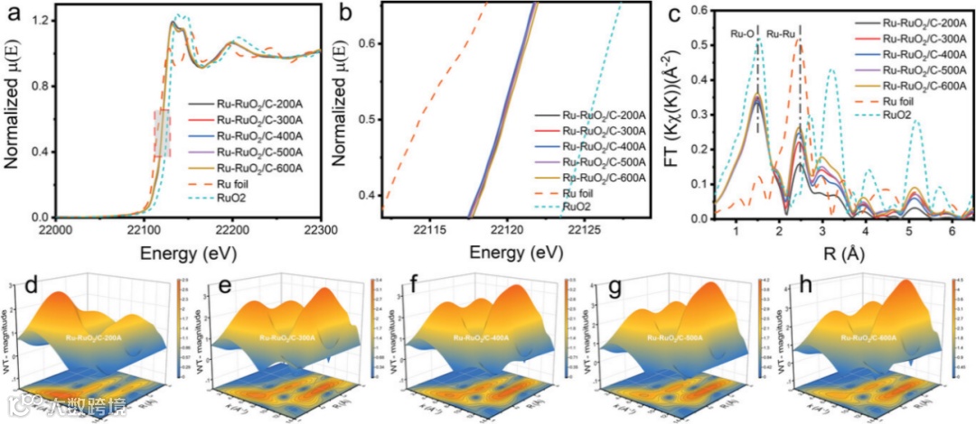 图2:a) Ru K-edge XANES光谱,b) 放大图 (a) 中的红色框,c) Ru-RuO₂/C 样品的 Ru K-edge XANES振荡的傅里叶变换。d-h) 相应的WT-EXAFS 曲线。