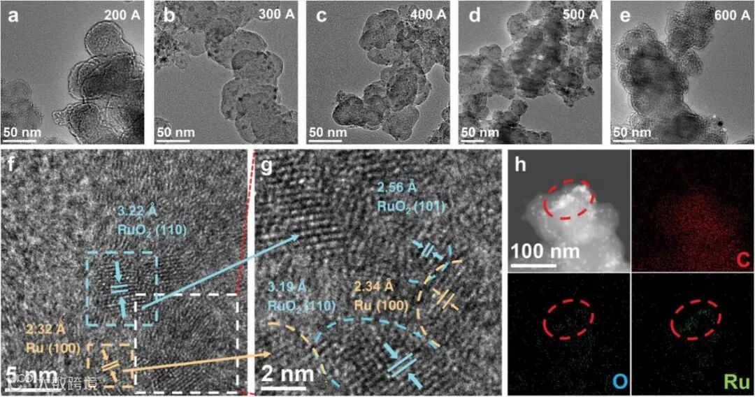 图1:a–e) 不同感应电流下制备的Ru-RuO₂/C-X样品的TEM图像;f) Ru-RuO₂/C-300A的高分辨率TEM图像及晶格条纹分析;g) 面板(f)中白色虚线框的放大图;h) 相应的元素分布图。