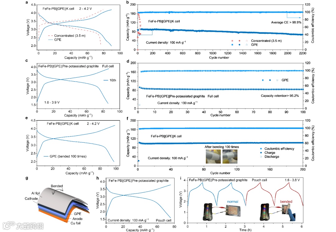 考虑到GPE的高氧化稳定性,采用正极材料锰基氧化物(KRMMO)和普鲁士蓝类似物(FeFe-PB,MnFe-PB)评价相应的电化学性能。当使用GPE(1 M)时,FeFe-PB正极在2200个循环内具有良好稳定性,容量保持率为80.6%,平均库仑效率大于99.9%。这远远优于3.5 M KFSI-DEE的电化学性能。在使用3.5 M KFSI-DEE时,FeFe-PB正极在40个循环后库仑效率降低,放电容量出现不可逆的衰减。此外,GPE(1 M)使MnFe-PB正极在2.0-4.3 V高电压区间下能够稳定运行130个循环,容量保持率为92.8%,可逆容量为102.9 mAh g−1。
