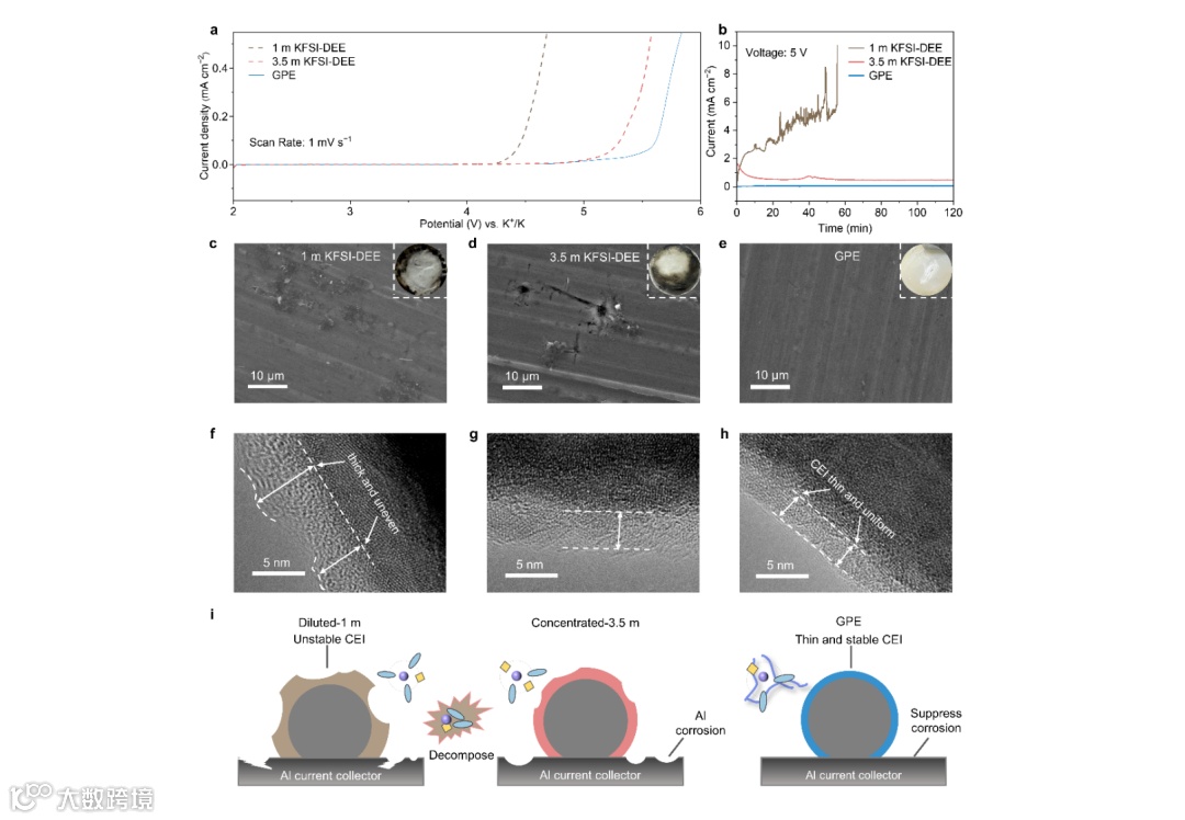 首先,用LSV测量K||Al电池,研究不同电解质在高压下的氧化稳定性。1 M KFSI-DEE在3.8-4.2 V的电压范围内表现出轻微的电流,随后由于电解液的分解或铝箔的腐蚀,电流急剧增加。GPE(1 M)在高达4.9 V的区间时具有较高的氧化稳定性,甚至优于3.5 M KFSI-DEE(4.7 V)的氧化稳定性。随后,在5 V的恒定电压下进行电流泄漏测试。使用GPE的电池在恒定电压5 V下几乎没有泄漏电流,同时相应的扫描电镜图像展现出铝箔表面光滑,这说明其具有优秀的稳定性以及由此产生的良好的电化学性能。