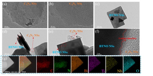 图2. TEM图:(a, b) C3N5, (c) BTNO, (d, f) C3N5/BTNO, (g) C3N5/BTNO TEM- EDS图。