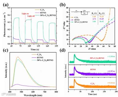 图4. (a) C3N5、BTNO和50%-C3N5/BTNO的光电流。(b) EIS奈奎斯特图(插图显示等效电路)。(c)稳态PL光谱(在360 nm处激发)。(d) 470 nm光发射的瞬态PL衰减曲线。