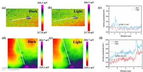 图5.(a, b) C3N5在黑暗和光照条件下的KPFM图像。(c)电位分布曲线与标记线相对应。(d, e) C3N5/BTNO在黑暗和光照条件下的KPFM图像。(f)标记线处对应的电位分布曲线。