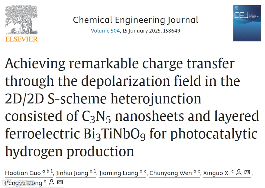 Haotian Guo1, Jinhui Jiang1, Jiaming Liang, Chunyang Wen, Xinguo Xi*, Pengyu Dong*, Achieving remarkable charge transfer through the depolarization field in the 2D/2D S-scheme heterojunction consisted of C3N5 nanosheets and layered ferroelectric Bi3TiNbO9 for photocatalytic hydrogen production, Chemical Engineering Journal, 504 (2025) 158649.