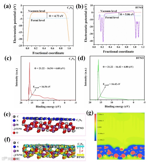 图7. (a) C3N5(001)表面的静电势。(b) BTNO(001)表面静电电位。(c) C3N5和(d) BTNO的UPS光谱。(e)几何优化后模拟了C3N5 (001)/BTNO(001)异质结界面的构建。(f)计算C3N5 (001)/BTNO(001)在等值面上的三维电荷密度差分布。(黄色和青色区域分别代表电子积累和消耗)。(g) C3N5/BTNO的二维差分映射电荷密度。(蓝色和红色区域分别代表电荷消耗和电荷积累区域)。