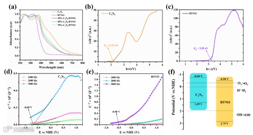 图6. (a)所有制备样品的UV-vis DRS光谱。(b, c) C3N5和BTNO的tauc图。(d, e) C3N5和BTNO的Mott-Schottky图。(f) C3N5和BTNO的能带位置。