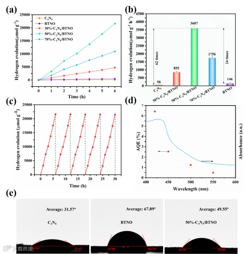图3. (a)模拟阳光下所有制备样品的H2生成情况。(b)所有合成样品的光催化制氢条形图,带有误差条。(c) 50%-C3N5/BTNO的稳定性实验。(d)各波长下的AQE值及对应的50%-C3N5/BTNO的UV-vis DRS。(e) C3N5、BTNO、50%-C3N5/BTNO的水接触角。