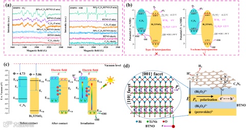 图8. (a) C3N5、BTNO和C3N5/BTNO的DMPO自旋捕获EPR光谱。(b) S型异质结和II型体系作为C3N5/BTNO电荷转移的两种可能途径的示意图。(c) S-scheme C3N5/BTNO异质结构在黑暗和模拟阳光下接触前后的电荷迁移过程示意图。(d) C3N5/BTNO的铁电增强S-scheme电荷转移行为示意图(插图:BTNO的晶体结构)。