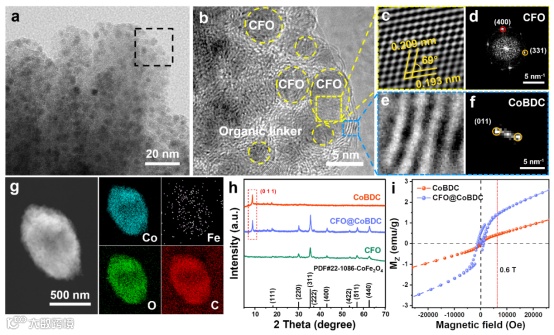 图1. CFO@CoBDC的结构分析。a) CFO@CoBDC的透射电子显微镜(TEM)图像;b) a)中选定黑色区域的高分辨透射电子显微镜(HRTEM)图像。c, d) 选定黄色区域的HRTEM图像和快速傅里叶变换(FFT)图案。e, f) 选定蓝色区域的HRTEM图像和FFT图案。g) CFO@CoBDC的高角度环形暗场扫描透射电子显微镜(HAADF-STEM)图像及相应的能量色散X射线光谱(EDS)。h) CoBDC、CFO@CoBDC和CFO的X射线衍射(XRD)图案。i) CoBDC和CFO@CoBDC在室温下的磁滞回线。