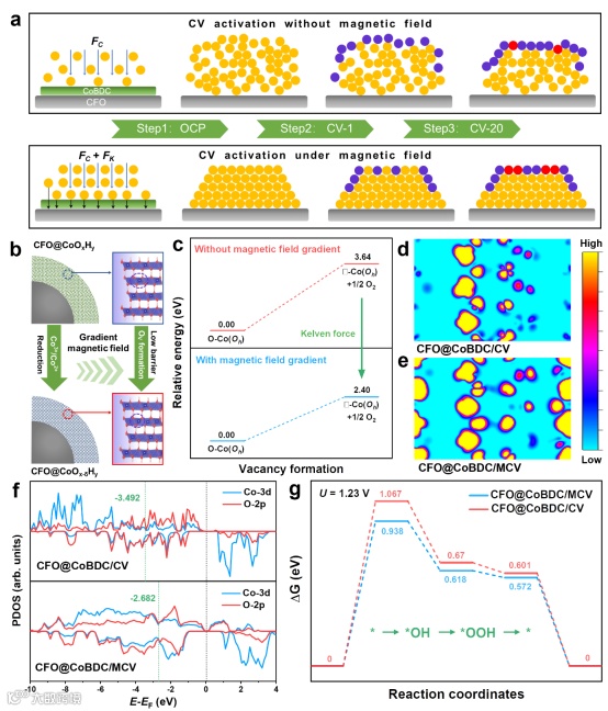 图4. 磁场对催化剂结构和性能影响的机理分析。a) CV活化下钴位点构型演变示意图,黄色、蓝色和红色球体分别代表Co2+、Co3+和具有氧空位OV的Co位点;b) CFO@CoOxHy中形成更多Co2+的示意图;c) 有无磁场条件下CoOOH的氧空位形成能,Co-O(Oh)代表八面体构型中的钴-氧结构;d, e) CFO@CoBDC/CV和CFO@CoBDC/MCV的(001)平面的2D自旋密度分布图;f) CFO@CoBDC/CV和CFO@CoBDC/MCV的Co-3d和O-2p轨道的投影态密度(PDOS);g) 1.23 V下CFO@CoBDC/CV和CFO@CoBDC/MCV的OER自由能台阶图。