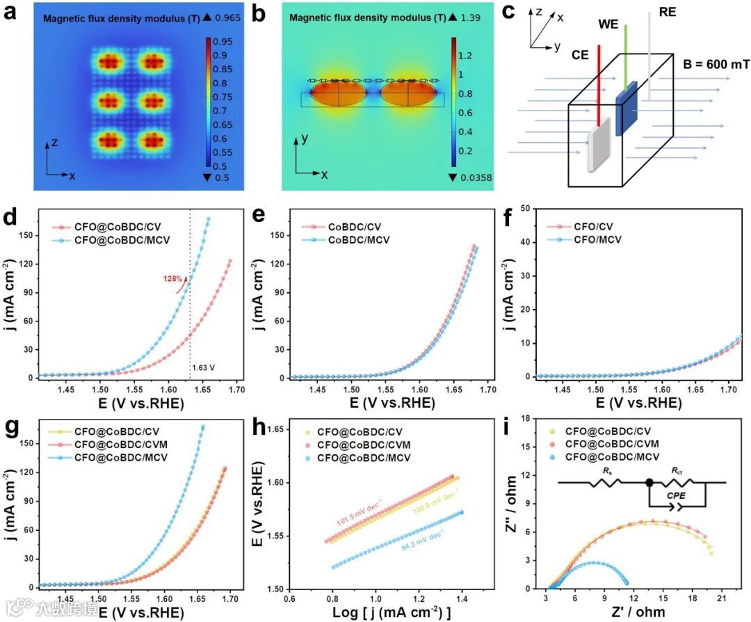图2. 磁场辅助的OER。a, b) 催化剂沿xz和xy平面的磁通密度分布模型;c) 磁场下电化学活化和电解示意图,WE、CE和RE分别代表工作电极、对电极和参比电极;d) CFO@CoBDC、e) CoBDC/CV和f) CFO/CV在活化过程中有无外磁场辅助时的极化曲线;g) CFO@CoBDC/CV、CFO@CoBDC/MCV和CFO@CoBDC/CVM的极化曲线;h) Tafel斜率;i) CFO@CoBDC/CV、CFO@CoBDC/MCV和CFO@CoBDC/CVM的Nyquist图,插图为等效电路图。