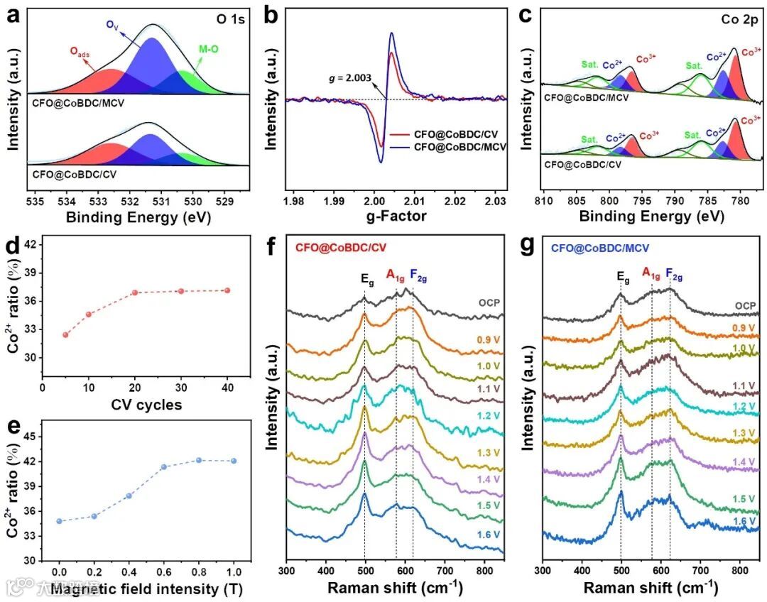 图3. 磁场辅助重构的结构变化表征。a) CFO@CoBDC/CV和CFO@CoBDC/MCV的高分辨率O 1s X射线光电子能谱(XPS)谱图;b) CFO@CoBDC/CV和CFO@CoBDC/MCV的电子顺磁共振(EPR)谱图;c) CFO@CoBDC/CV和CFO@CoBDC/MCV的高分辨率Co 2p XPS谱图;d) CFO@CoBDC/MCV中二价钴比例与循环伏安(CV)周期的关系;e) CFO@CoBDC/MCV中二价钴比例与磁场强度的关系;f, g) CFO@CoBDC/CV和CFO@CoBDC/MCV的原位拉曼光谱图。
