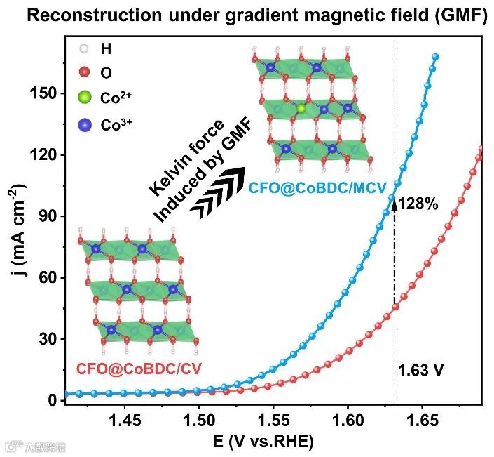 图1. 梯度磁场下原位重构策略增强电催化析氧反应。