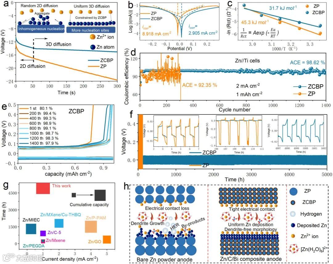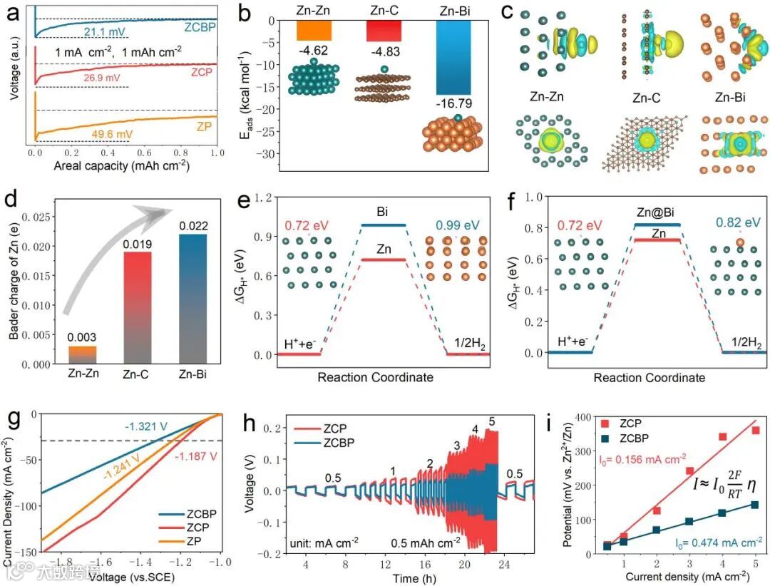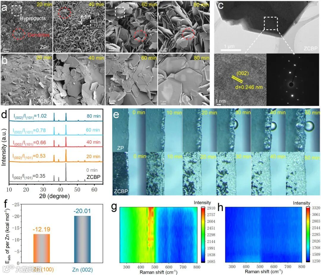 2,铋纳米片与锌离子之间存在较高的吸附能,从而增强了电化学过程中的Zn2+的传输,诱导Zn(002)晶面沉积在电极表面。这种平面沉积机制有效抑制了锌枝晶的形成。