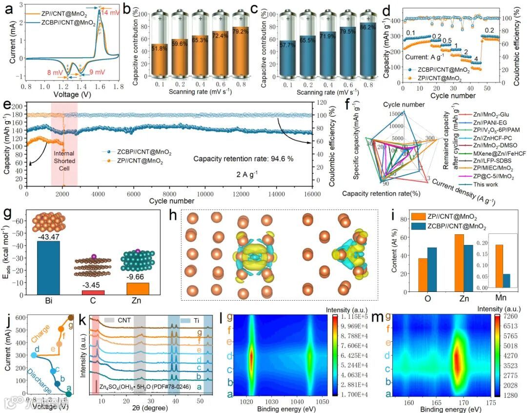 本文报道了通过高温渗锌和液相还原的两步策略制备了一种三层高尔夫型复合阳极,其具有高稳定性和耐久性。研究发现,独特结构的锌碳铋复合阳极不仅为电子转移提供了连续丰富界面,还有效减轻了锌金属在电镀/剥离过程中产生的体积膨胀与收缩。理论计算与实验表征结果表明,铋纳米片与锌离子之间存在较高的吸附能,不仅降低了电化学过程中Zn2+的传输障碍,还能够诱导Zn(002)晶面沉积在锌阳极表面。这种平面沉积机制有效抑制了锌枝晶的生长。此外,铋金属界面的构建抑制了锌金属/电解液界面的析氢反应,交联的碳球还能够在锌金属电镀/剥离过程中保持结构稳定,从而有效地抑制了电极的电接触损失。电池测试结果表明,在2 A g−1的大电流密度条件下,锌锰全电池经过16000次循环后,容量保持率仍然高达94.6%,远远超过了使用纯锌粉ZP//CNT@MnO2全电池的循环寿命。