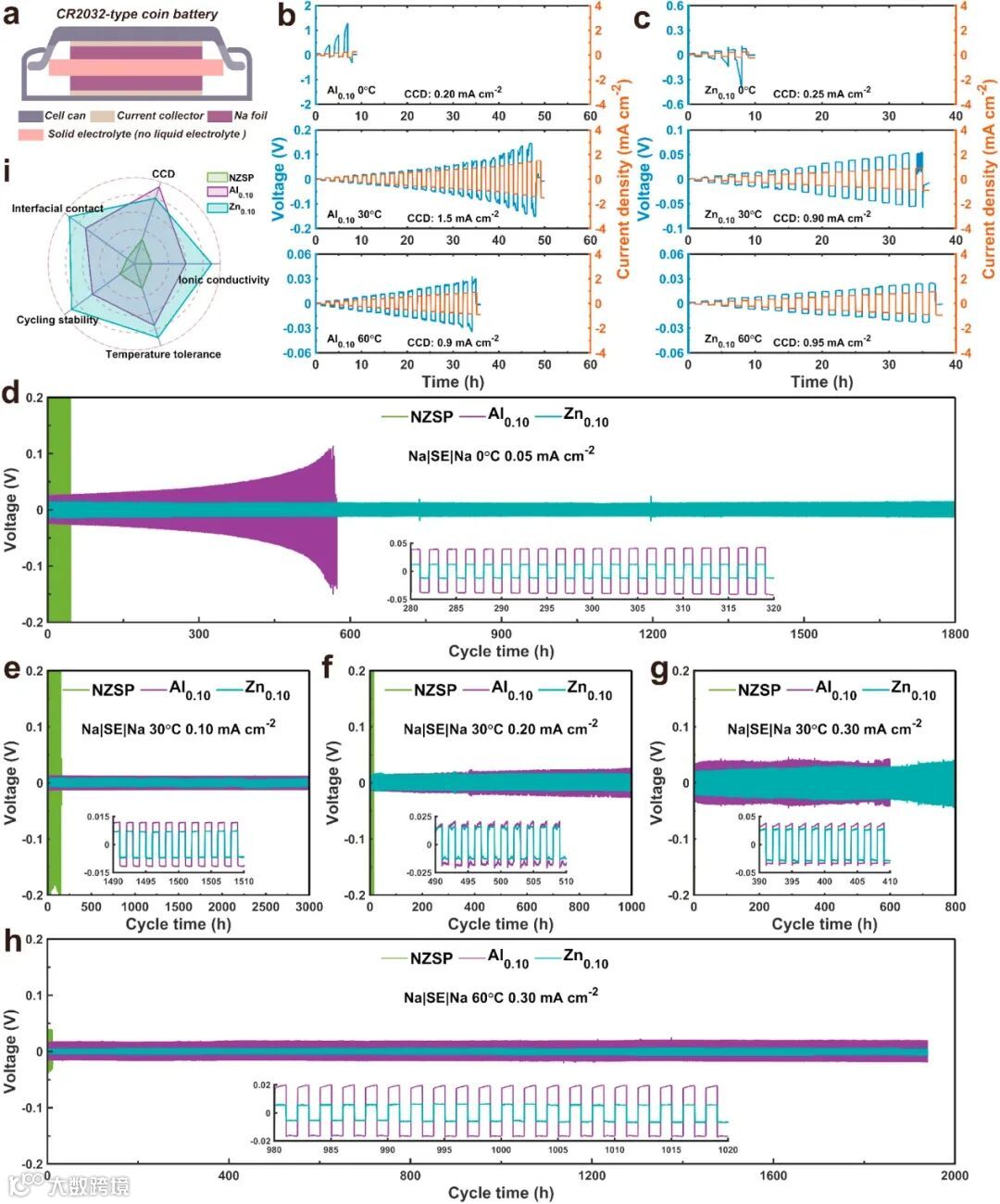 图3. (a) CR2032型Na|SE|Na对称电池的示意图。(b) Al0.10在0°C、30°C和60°C下的临界电流密度曲线。(c) Zn0.10在0°C、30°C和60°C下的临界电流密度曲线。(d) 在0°C下,Na对称电池在0.05 mA cm⁻²电流密度下的恒流充放电曲线。(e, f和g) 在30°C下,Na对称电池在0.10–0.30 mA cm⁻²电流密度范围内的恒流充放电曲线。(h) 在60°C下,Na对称电池在0.30 mA cm⁻²电流密度下的恒流充放电曲线。(i) NZSP、Al0.10和Zn0.10在电化学性能方面的雷达图。