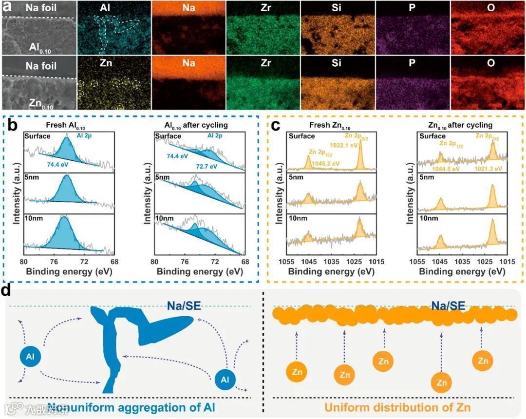 图4. (a) 钠沉积/解离后Zn0.10和Al0.10截面SEM图像。(b) 循环前后Al0.10 XPS深度剖析分析。(c) 循环前后的Zn0.10 XPS深度剖析分析。(d) 钠沉积/解离过程中Al和Zn迁移动力学示意图。