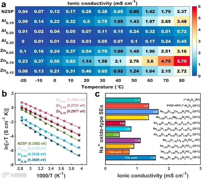 图1. (a) 在-20至80°C温度范围内,NZSP、Alx(x=0.10、0.20和0.30)和Znx(x=0.05、0.10和0.15)的离子电导率。(b) 在-20至80°C温度范围内,NZSP、Alx和Znx的阿伦尼乌斯图。(c) 典型Na+氧化物型固体电解质离子电导率比较。