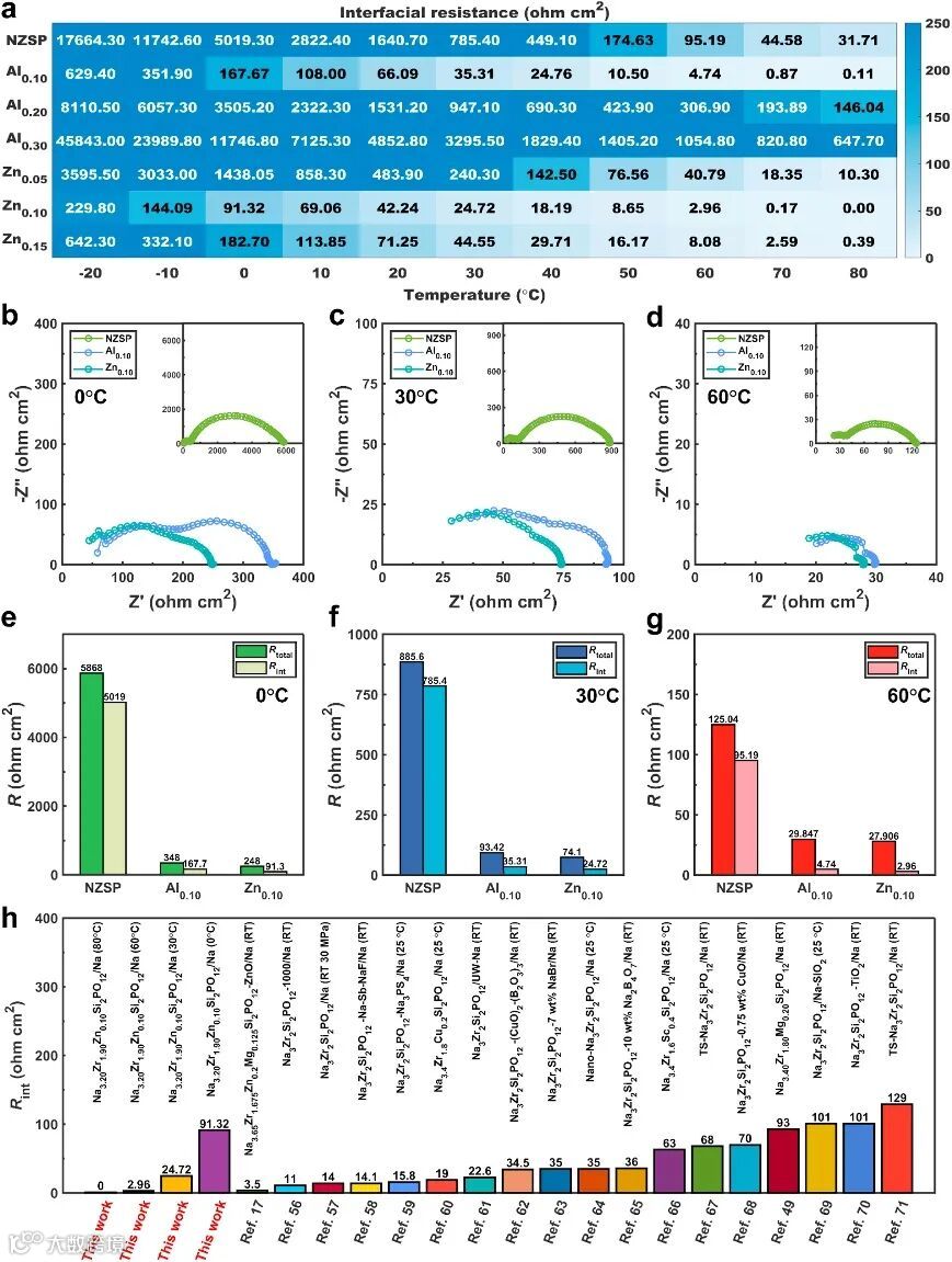 图2. (a) 在-20°C至80°C温度范围内,使用NZSP、Alx(x=0.10、0.20和0.30)和Znx(x=0.05、0.10和0.15)作为固体电解质的Na|SE|Na电池的界面电阻。(b, c 和 d) 分别使用NZSP、Al0.10和Zn0.10作为固体电解质,在0°C、30°C和60°C下的Nyquist图。(e, f 和 g) Na|SE|Na电池的总电阻Rtotal和界面电阻Rint。(h) 与文献中的Na对称电池界面电阻的比较。