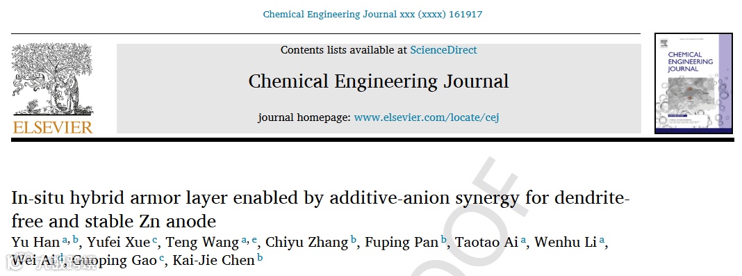 基于此,来自陕西理工大学的艾桃桃教授、王腾教授与西北工业大学的陈凯杰教授合作,在国际知名期刊Chemical Engineering Journal上发表题为“In-Situ Hybrid Armor Layer Enabled by Additive-Anion Synergy for Dendrite-Free and Stable Zn Anode”的科研文章。该文章首次发掘了电解质阴离子和添加剂之间的协同效应用于提升锌负极稳定性,显示出了巨大的应用潜力。