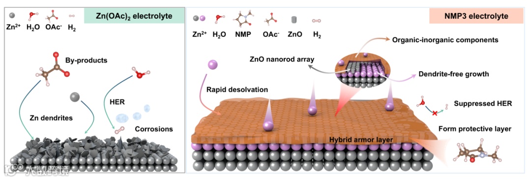 图1. Zn(OAc)2(左)和NMP3(右,改性后)电解质中锌沉积机制的示意图。
