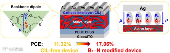 图1. 含B←N键不对称分子结构及其用作有机光伏器件阴极界面层的器件示意图