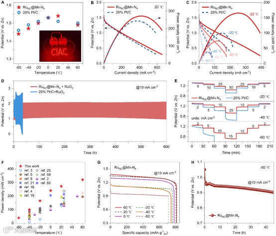 RuNC@Mn-N4催化剂优异的ORR性能启发我们探索其在AWT-ZABs(60°C 至 -60°C)中的实际潜力,这是应对极端气候所必需的。在AWT-ZABs中,RuNC@Mn-N4在 60℃ 时达到 320.6 mW cm-2 的峰值功率密度 (Pmax), 在 -20℃ 至 -60℃ 时 Pmax 比Pt/C高 1.5 至 3 倍。此外,即使在很宽的温度范围内(-60°C 至 60°C),RuNC@Mn-N4驱动的锌空气电池在倍率性能和比容量上相比Pt/C也有显著优势。