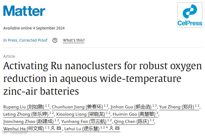 长春应化所逯乐慧/何文辉团队Matter:活化Ru纳米团簇用于水系宽温锌-空气电池中的强效氧还原