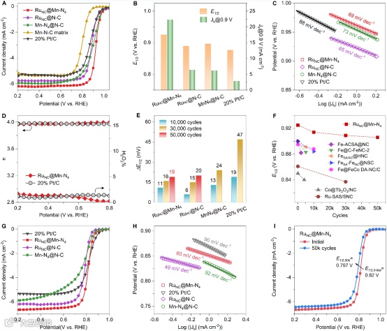 RuNC@Mn-N4的LSV曲线显示E1/2为0.925V,比商用20% Pt/C(0.877 V)、Mn-N4@N-C(0.896 V)和 RuNC@N-C(0.889 V)分别高出 48、29 和 36 mV(图 3A)。RuNC@Mn-N4的相应动能电流密度(Jk@0.9 V)达到 22.3 mA cm-2,约为 20% Pt/C 的 7.7 倍,远远优于 Mn-N4@N-C 和 RuNC@N-C(图 3B)。这种正的 E1/2 和优异的 Jk@0.9 V 使 RuNC@Mn-N4成为最活跃的最先进的 ORR 电催化剂之一。添加Ru簇后,RuNC@Mn-N4和 RuNC@N-C 的 Tafel 斜率值很接近,分别为 69 和 65 mV dec-1,低于 Mn-N4@N-C和 20% Pt/C(图 3C)。这一发现表明 RuNC@Mn-N4和 RuNC@N-C 具有相似的 ORR 机制,以及 Ru NCs 在加速 ORR 动力学方面的优势。RuNC@Mn-N4的 E1/2 在 50,000 次循环后仅出现 19 mV 的损失,与 RuNC@N-C在 50,000 次循环后出现的损失(20 mV)相当,但明显优于Mn-N4@N-C 在 30,000 次循环后出现的损失(24 mV)和 20% Pt/C 在 30,000 次循环后出现的损失(47 mV)。同时RuNC@Mn-N4在酸性介质中也表现出优异的活性和稳定性,以及优异的ORR反应动力学。