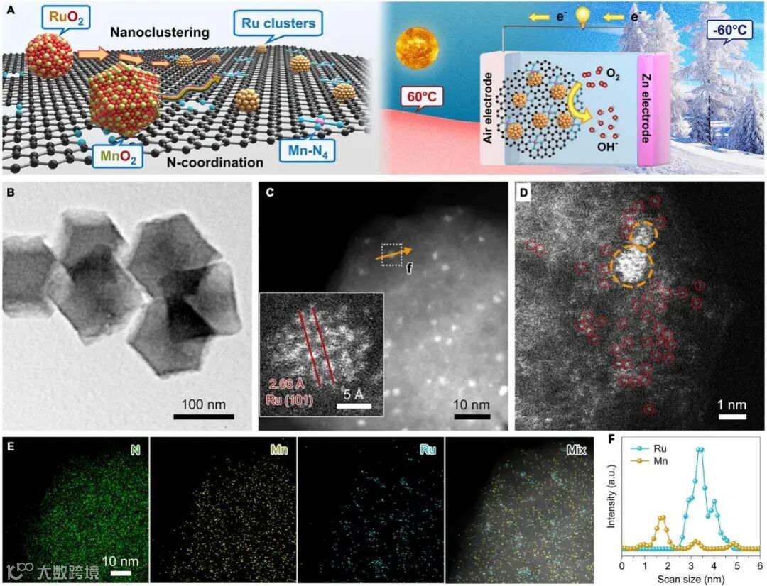 目前,将高度分散的 N 配位 M3d-SA (M3d-N4) 位点与 M3d-NCs或Pt纳米粒子 (NPs) 结合在一起,已成为开发新型混合催化剂的一种引人注目的策略,这种催化剂可优化 ORR 中间体的吸附/解吸强度。然而,之前的研究主要集中在通过负载 M3d-NC 作为促进剂来调整 M3d-N4催化位点的d带结构或自旋构型,而只有少数研究涉及通过在碳基质中掺杂 M3d-N4位点来调节 M3d-NC 的电子特性(主要是Fe和Pt NCs)。与 Pt/C相比,Ru 基催化剂对含 O 物种(如 OH*)的吸附更强,因此 Ru NC 与 M3d-N4位点(尤其是较少涉及Fenton反应的Mn-N4)的耦合有可能为平衡低温效应(ORR中间吸附减弱)与高效 O2 吸附和解离要求之间的 “权衡 ”提供一条可行的途径。然而,迄今为止,基于 Ru NCs 和 Mn-N4位点的混合催化剂在宽温能源系统中实现强效 ORR 的报道还从未有过。