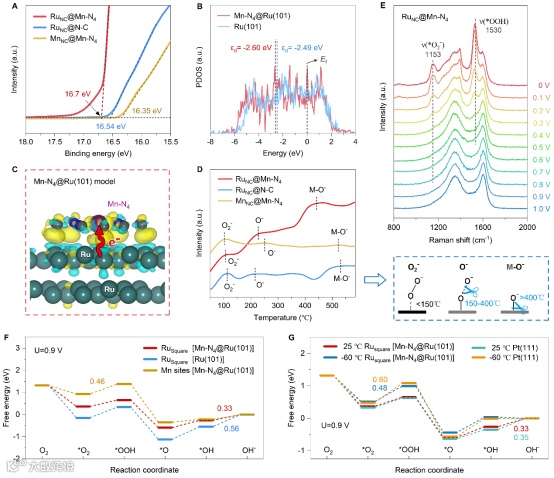 为了研究 RuNC@Mn-N4优异ORR性能的机制,首先采用紫外光电子能谱比较 RuNC@Mn-N4的功函数与仅含有单金属组分的 RuNC@N-C 和 Mn-N4@N-C。三种催化剂的功函数顺序为RuNC@Mn-N4(4.52 eV) < RuNC@N-C(4.68 eV) < Mn-N4@N-C(4.87 eV)(图 5A)。RuNC@Mn-N4的最低 功函数代表向吸附的 O2 捐献电子的最高驱动力,这有助于促进随后的 O-O 键断裂。