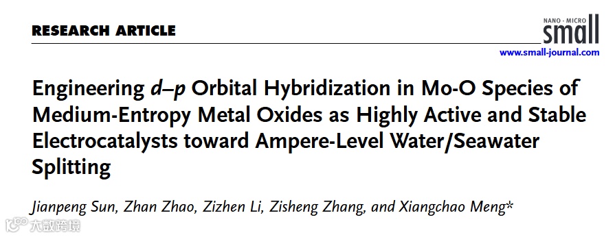 近日,来自中国海洋大学的孟祥超教授,在Small期刊上发表题为“Engineering d–p Orbital Hybridization in Mo-O Species of Medium-Entropy Metal Oxides as Highly Active and Stable Electrocatalysts toward Ampere-Level Water/Seawater Splitting”的文章。该文章利用碳热冲击法,实现了一系列中熵金属氧化物的制备。其中,优化的中熵金属氧化物(FeNiMo)O2/NF 在碱性水/海水中表现出了显著的 HER和OER 性能。该研究可为开发高活性和高稳定的中熵金属氧化物电催化剂提供可行的策略。