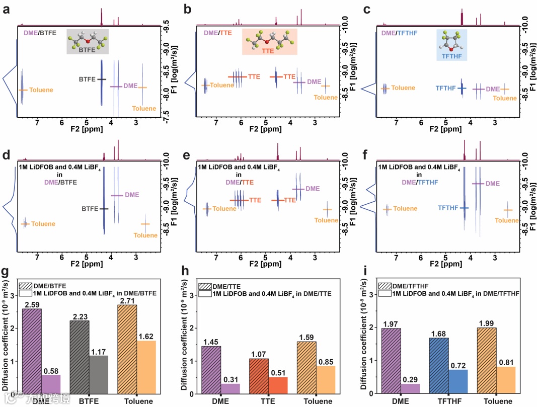 图2. 二元盐电解液中溶剂和稀释剂与锂离子的配位行为。a) DME/BTFE、b) DME/TTE、c) DME/TFTHF混合物的¹H DOSY NMR谱图;d) BTFE-E、e) TTE-E、f) TFTHF-E电解液的¹H DOSY NMR谱图;g) DME/BTFE、h) DME/TTE、i) DME/TFTHF混合物中溶剂和稀释剂在加入锂盐前后的扩散系数。以甲苯作为内部参考。