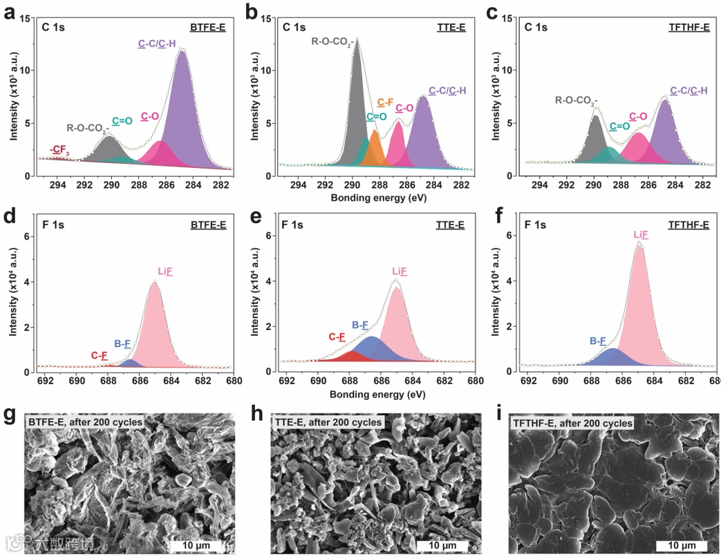 图5. SEI的化学组成分析及锂金属阳极形貌。a-d) BTFE-E、b-e) TTE-E和c-f) TFTHF-E电解液中形成的SEI的高分辨C 1s和F 1s XPS谱图;g-i) 锂金属阳极在Li||NMC811电池中循环200次后在BTFE-E、TTE-E和TFTHF-E电解液中的扫描电子显微镜(SEM)图像。